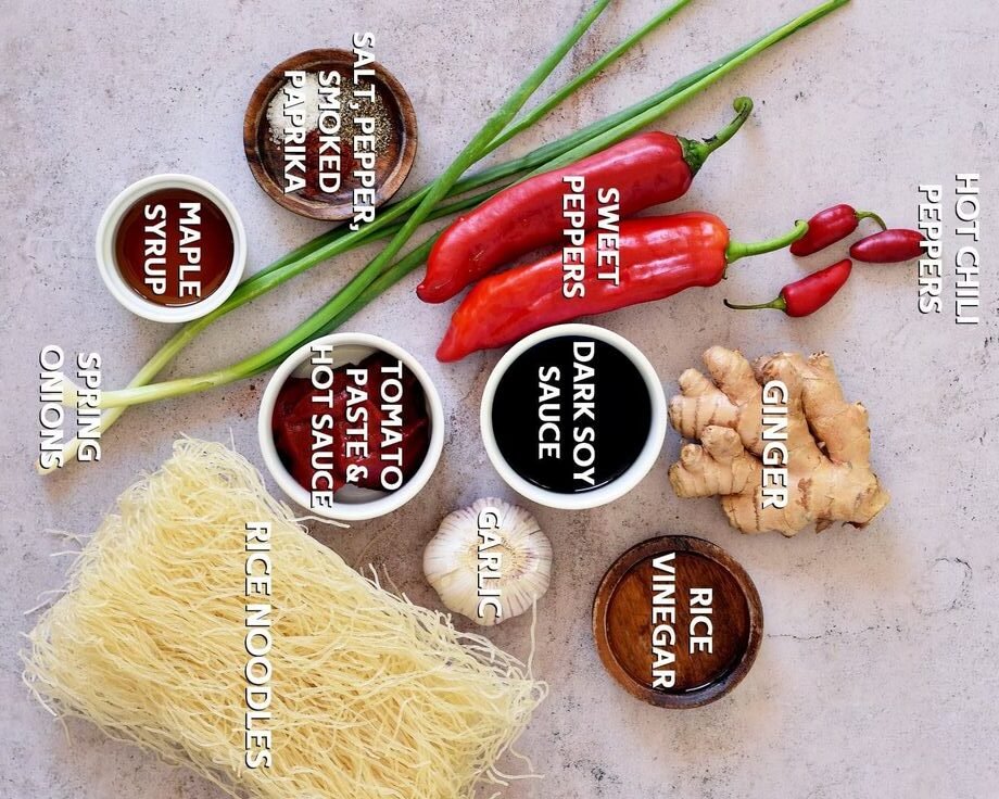 - 8 oz rice noodles (wide or thin—wide ones hold the sauce better in my opinion)